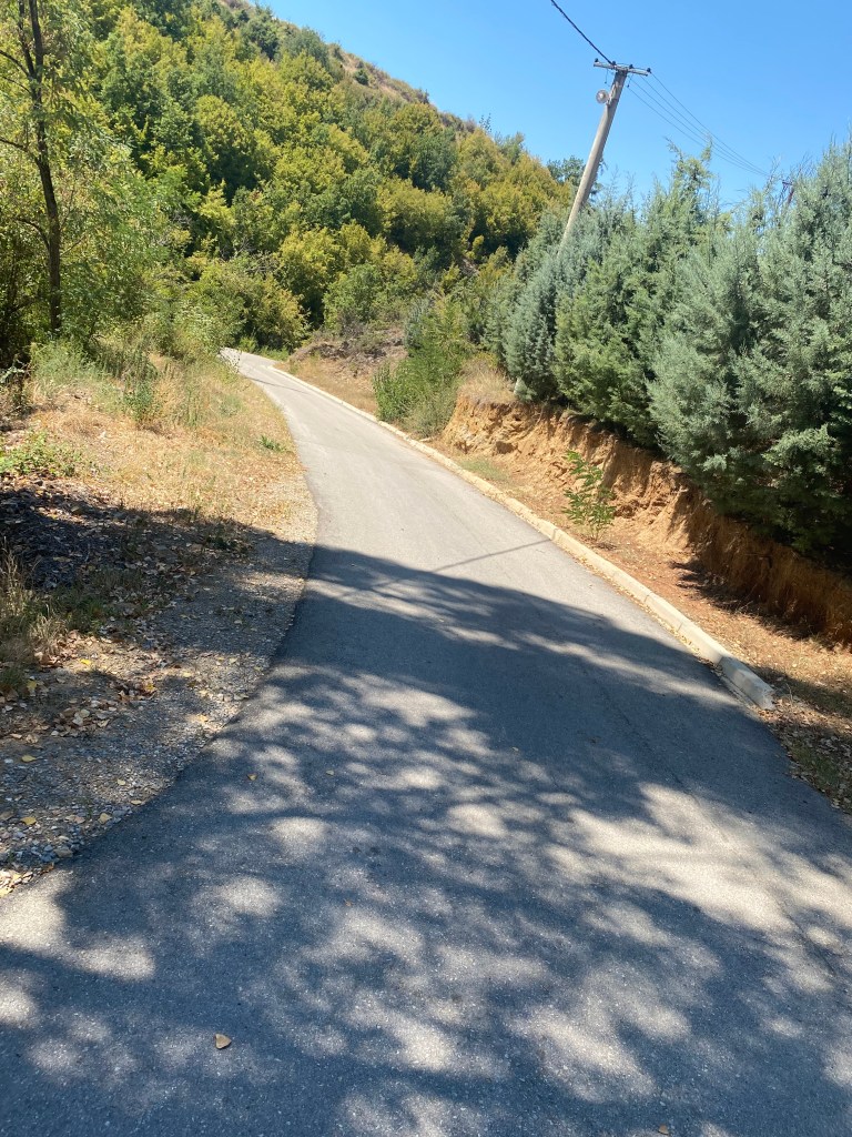 We learned that there is a monastery further up the mountain at the far end of the village, so we decided to check it out. Before long, the asphalt road turned into a gravel path, and we passed several houses that appeared almost off-grid. At one house, we saw water being pumped from a well at the bottom of the garden.